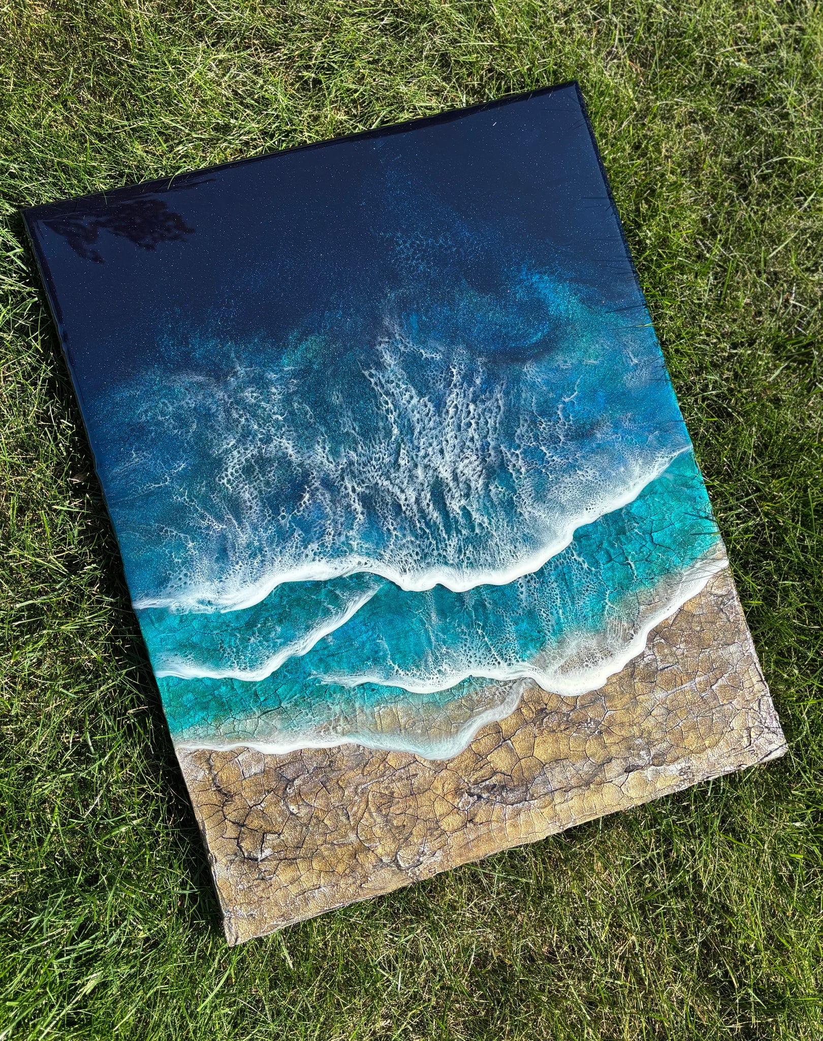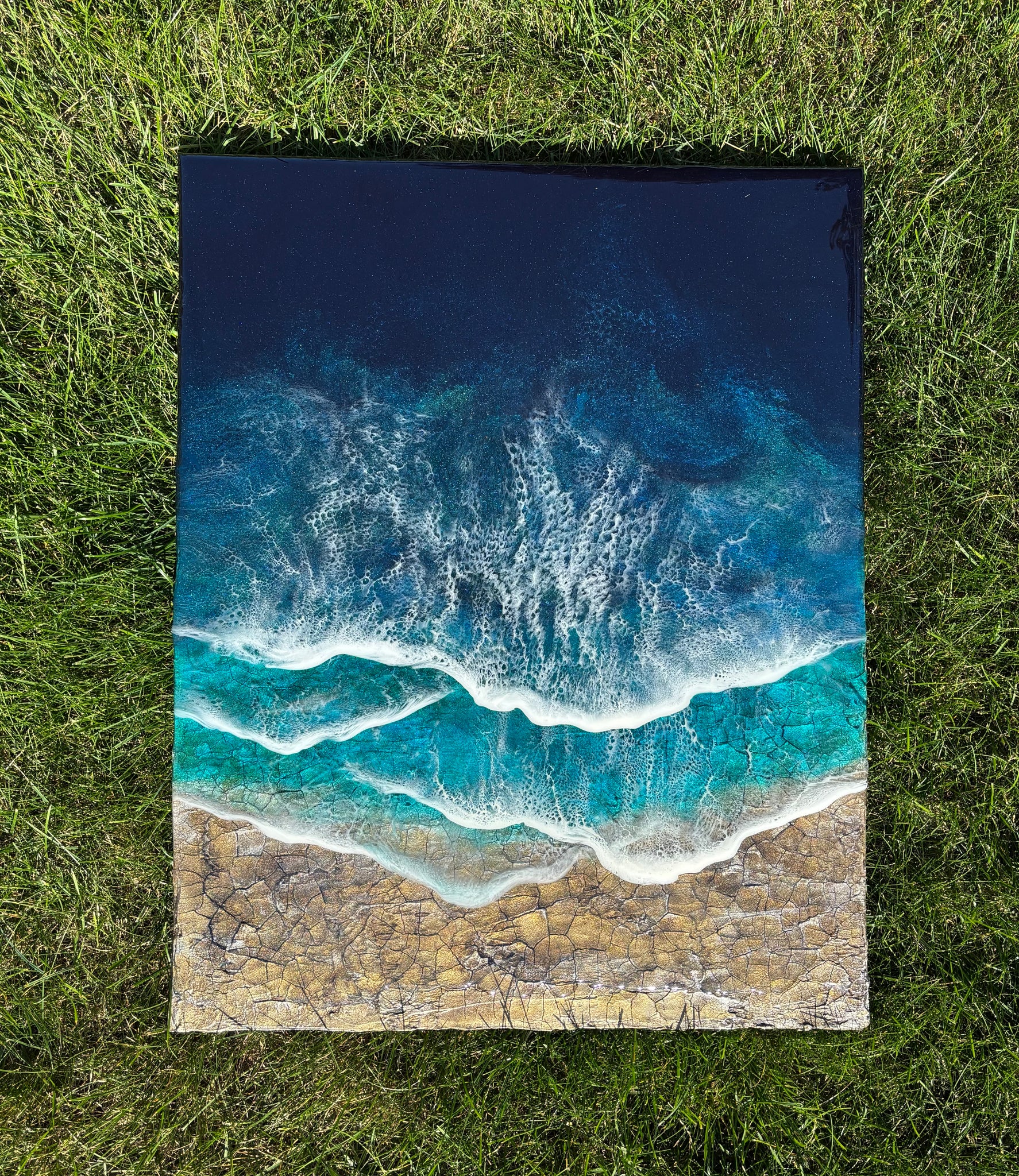 Dive into the deep blue waters of this 16x20 ocean resin painting.